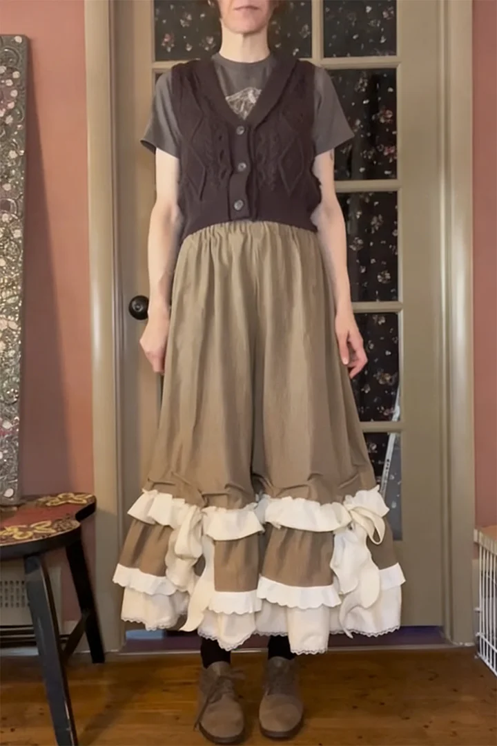 The hem is elevated by layered off-white ruffles (trimmed with delicate lace) and charming off-white bow details, balancing the muted base color with sweet, romantic texture for a vintage cottagecore vibe.