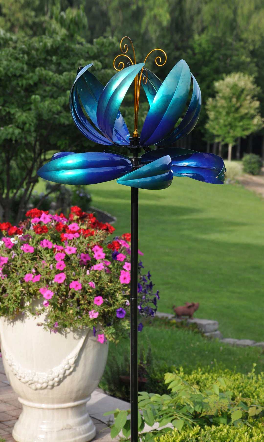As the wind spins this metal art, you can show off your creativity and create a beautiful display in your yard.