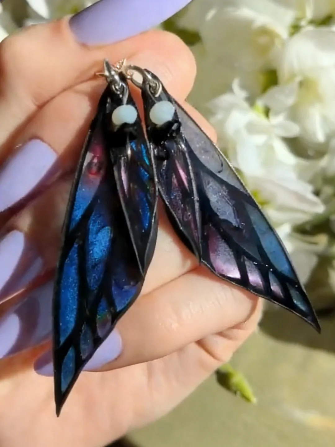 Glass-like translucent wings with deep, shadowed tones and a subtle inner shimmer ✨