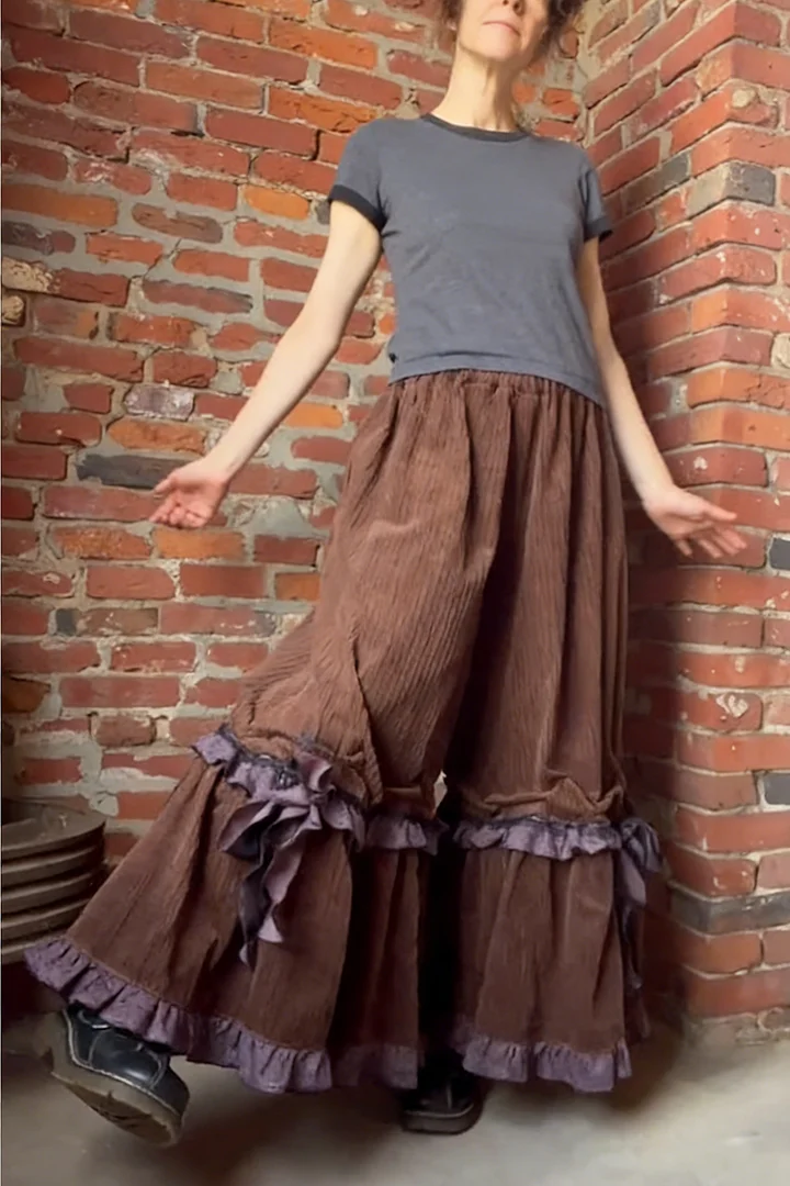 Crafted from rich chocolate brown crinkled fabric, these bloomers feature a long, wide-leg maxi silhouette designed for dramatic, flowy movement.