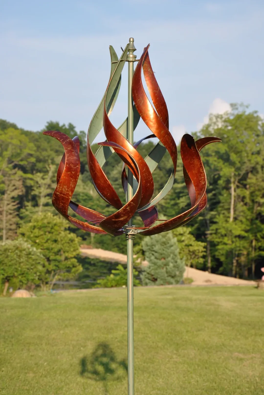As the wind spins this metal art, you can show off your creativity and create a beautiful display in your yard.