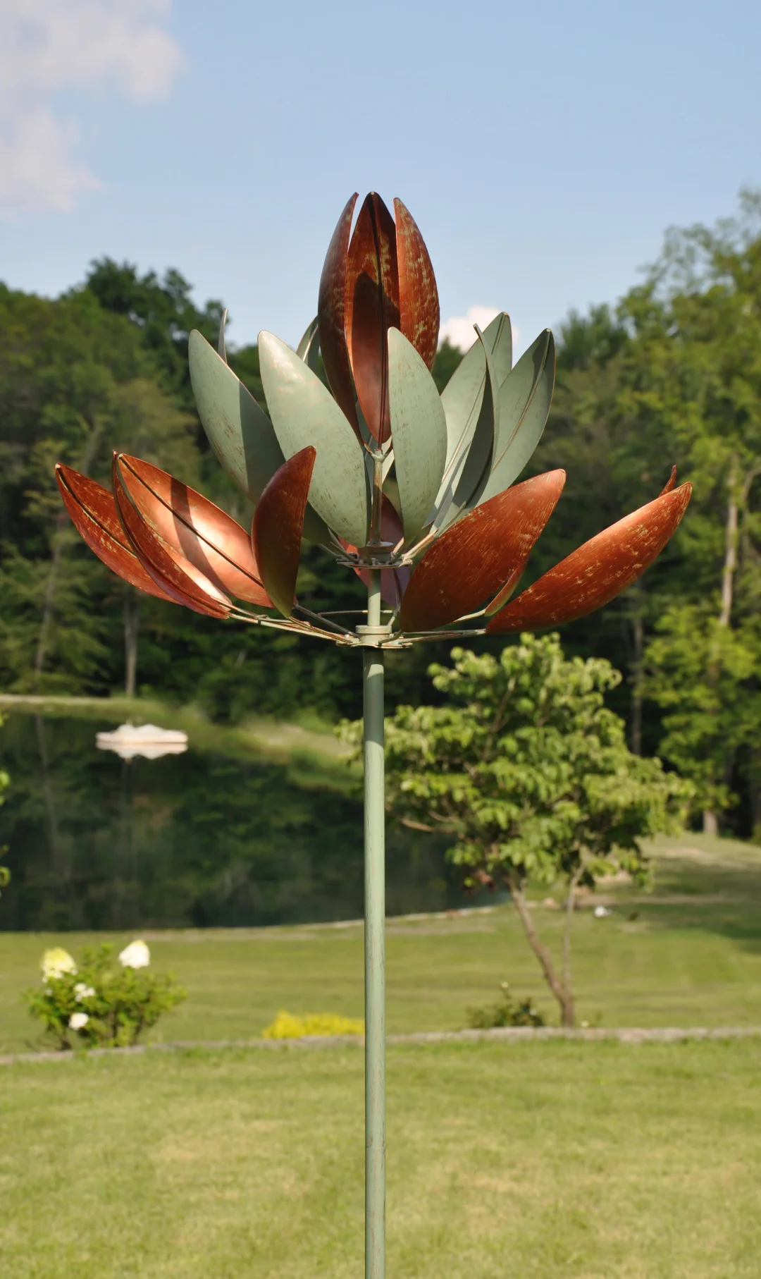 As the wind spins this metal art, you can show off your creativity and create a beautiful display in your yard.