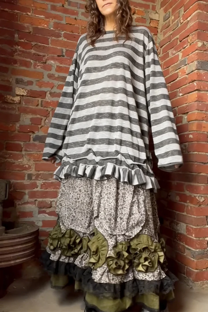 Layered ruffled tiers are elevated with olive green ruffled rosette accents—merging grunge edge with cottagecore softness to create a unique, textured vintage look.