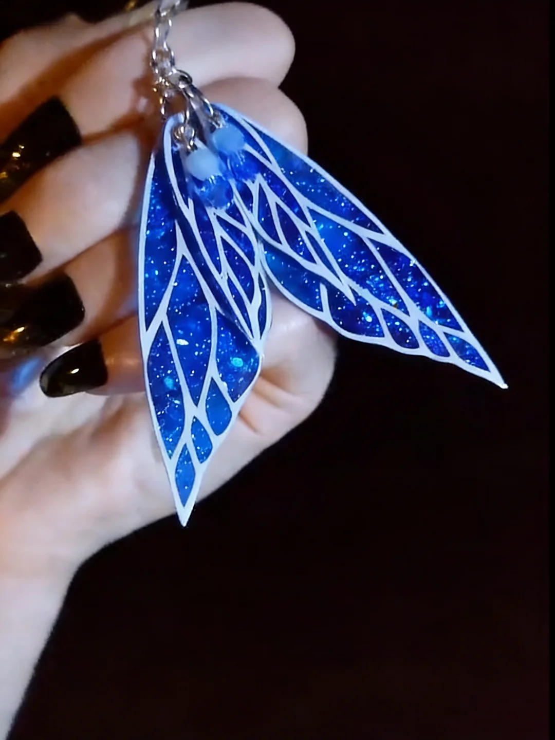 Glass-like translucent wings in a deep ocean blue with fine, star-like shimmer ✨