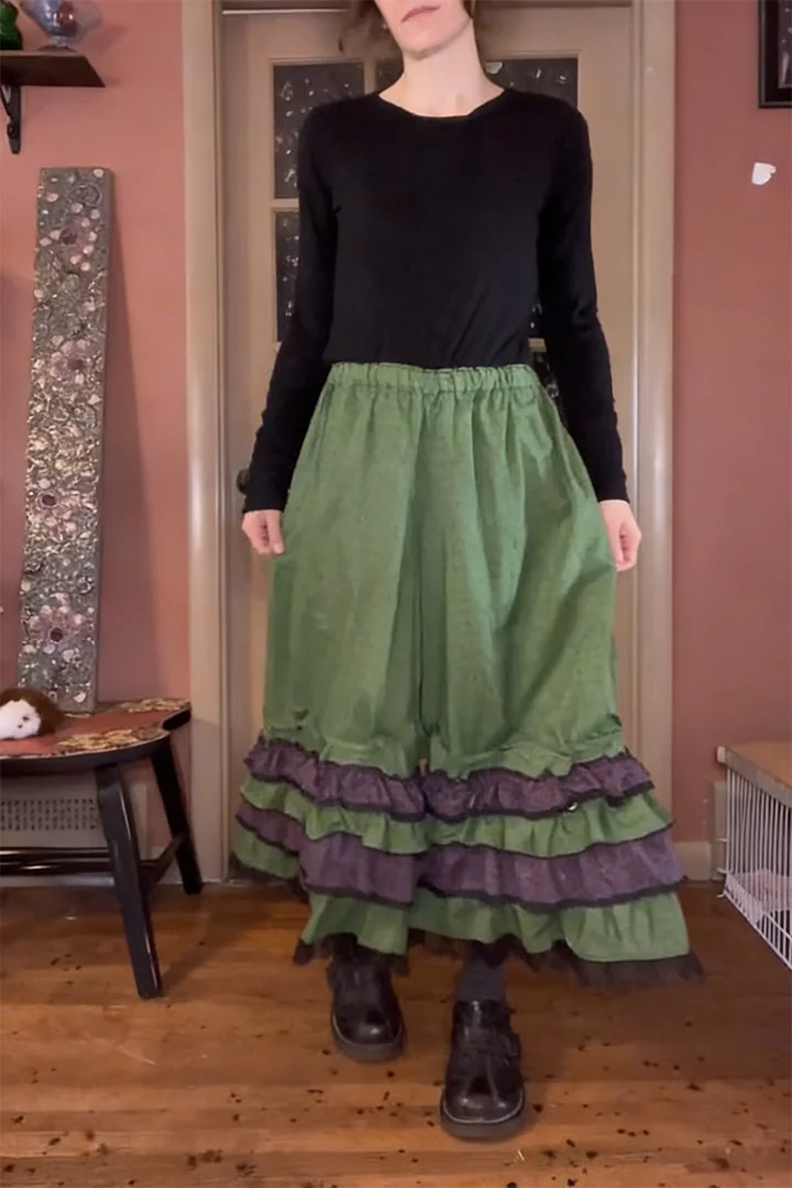 Alternating moss green and lavender floral fabric sections (trimmed with dark gray edging) create a whimsical, vintage-inspired look—balanced by the soft ruffled construction for added volume and charm.