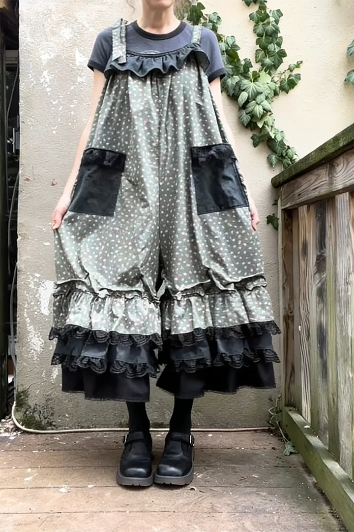 Contrast black ruffles and patch pockets add visual depth, while adjustable shoulder ties allow for a customizable fit.