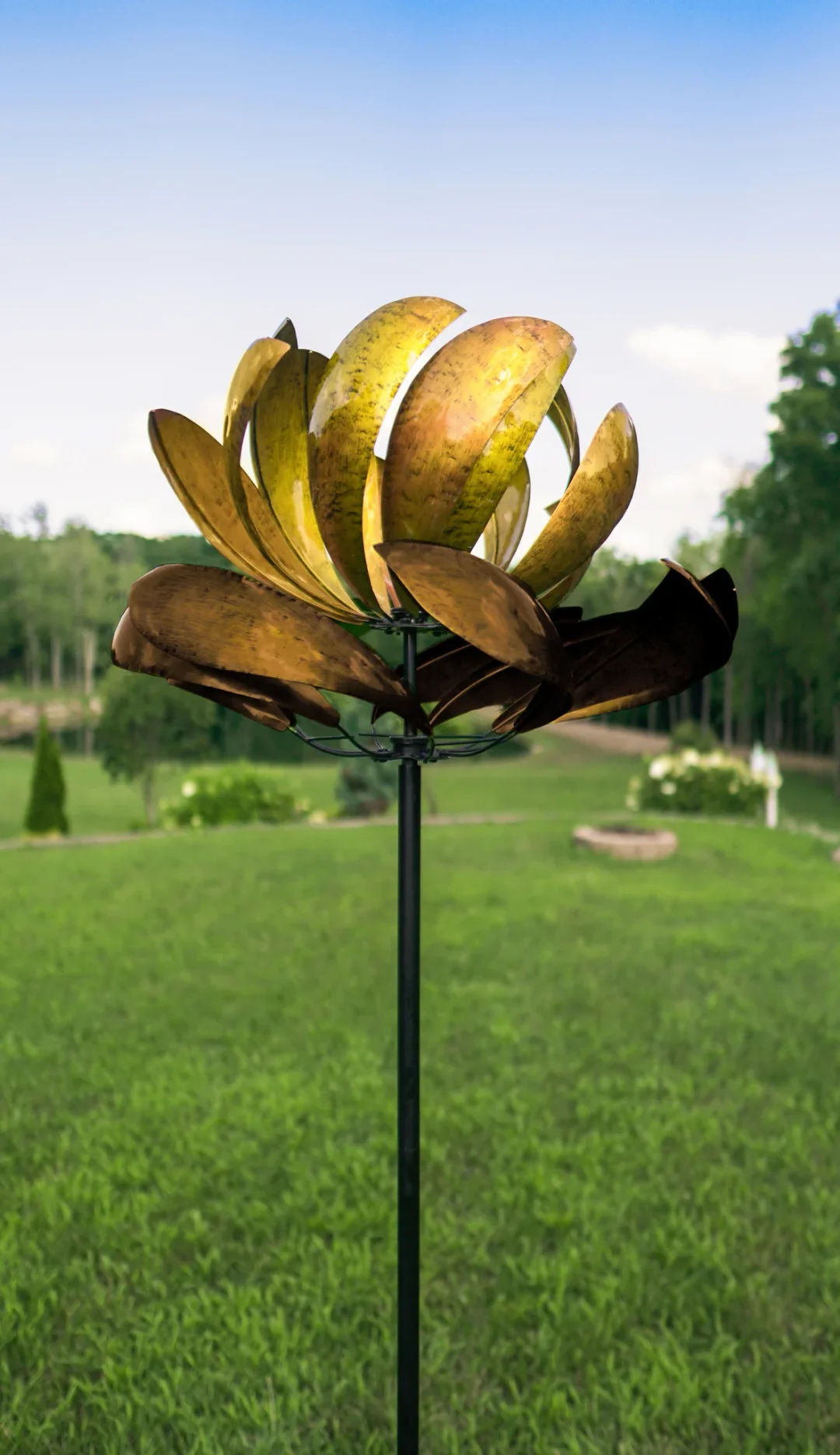 As the wind spins this metal art, you can show off your creativity and create a beautiful display in your yard.